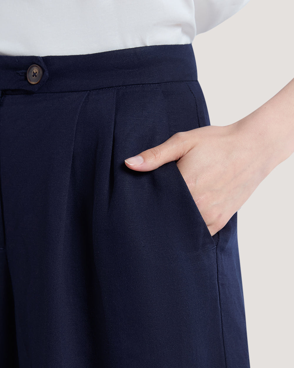 These tailored summer shorts are crafted from a lightweight blend of European flax linen and viscose. Cut for a regular fit with a mid-rise waist, they are relaxed over the hips with a straight leg and mid-thigh length. Details include an extended waistband, front slanted pockets, back welt pockets, front pleats and crease detailing.