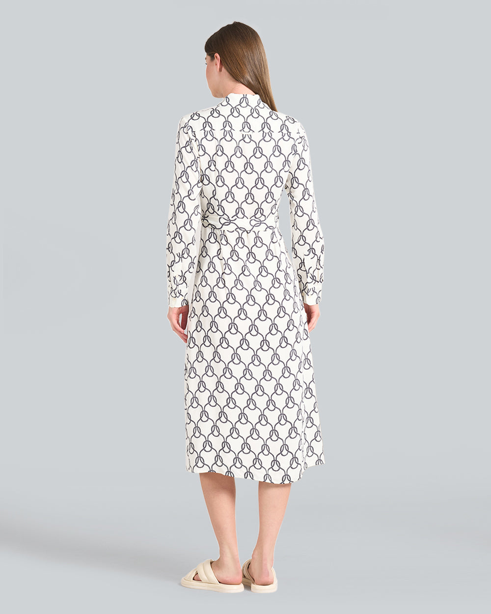 Crafted from a drapey, fluid viscose, this shirt dress is designed with a slim fit and a flattering midi length. Adorned with an all-over rope print pattern, the design is detailed a point collar, adjustable cuffs, a belted waist and a straight hemline.